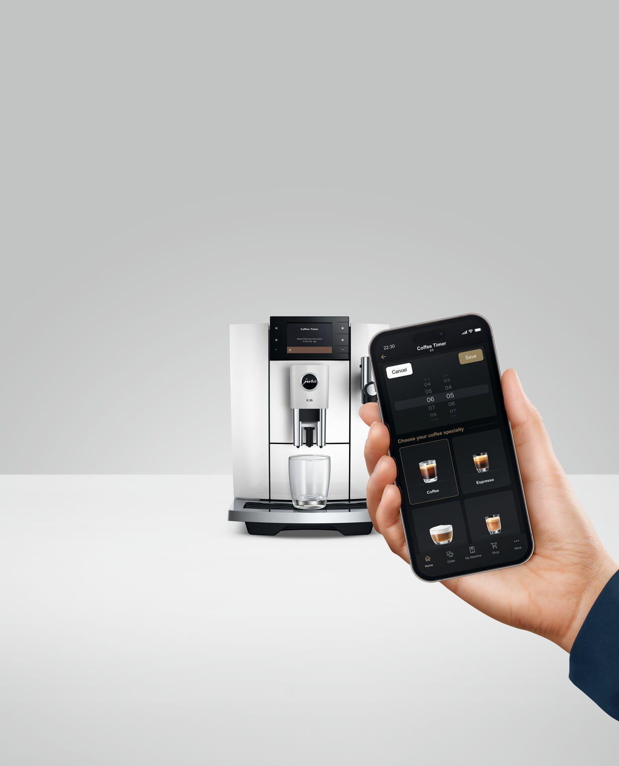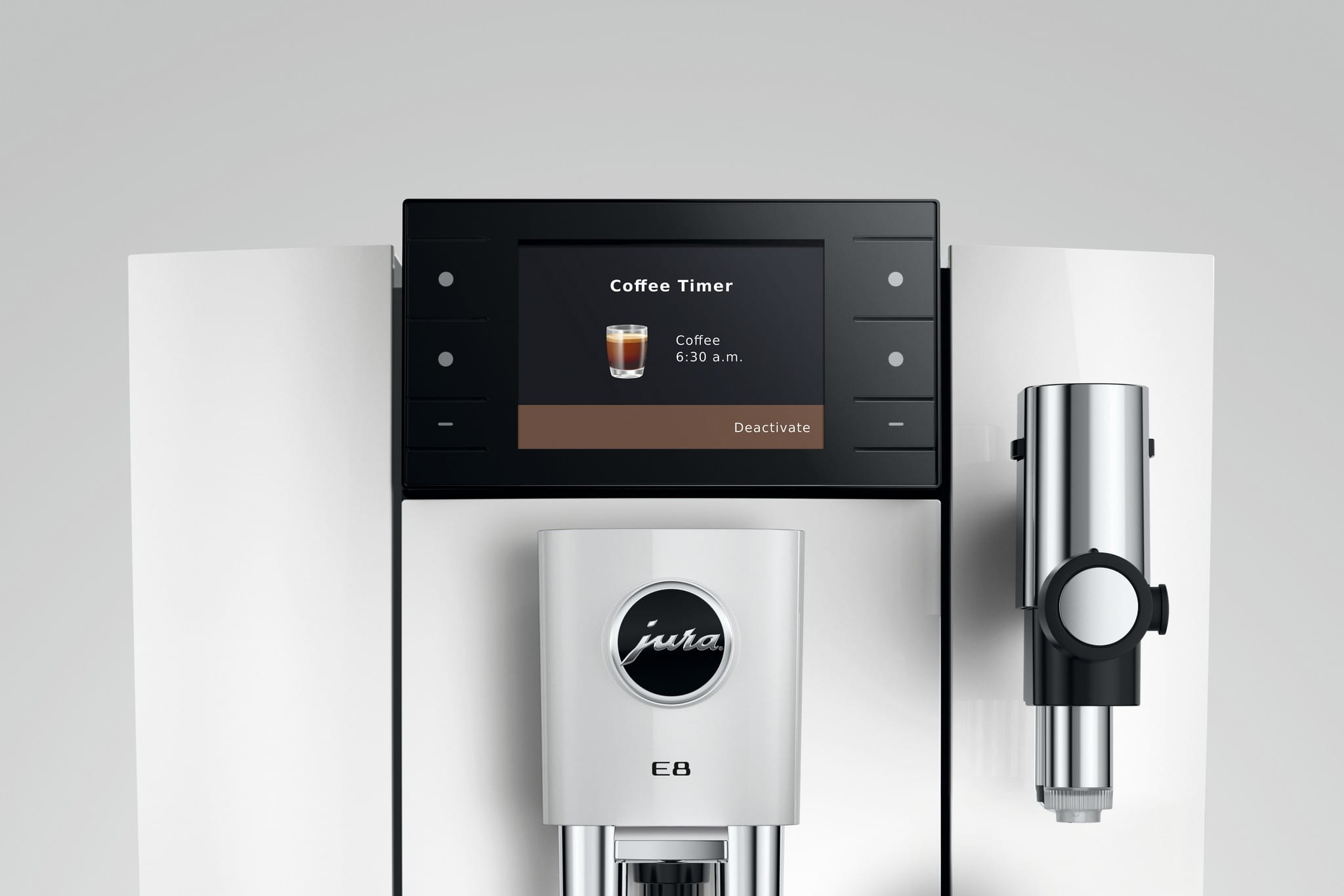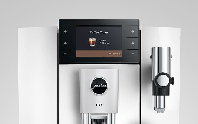 E8 fascynuje również inteligentnymi technologiami, takimi jak Coffee Timer. Dzięki niemu możesz zaprogramować swoją poranną kawę za pośrednictwem aplikacji J.O.E.® i cieszyć się świeżo mieloną i przyrządzoną kawą zaraz po wstaniu z łóżka.