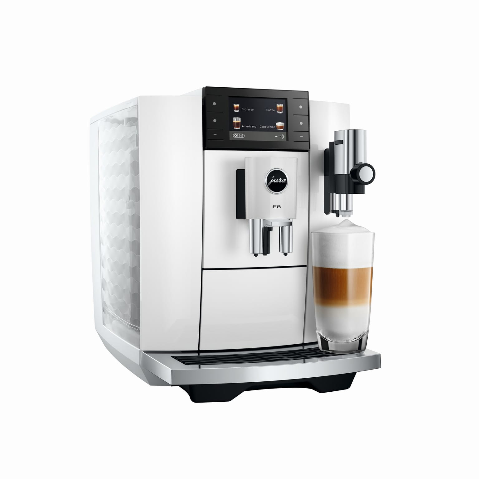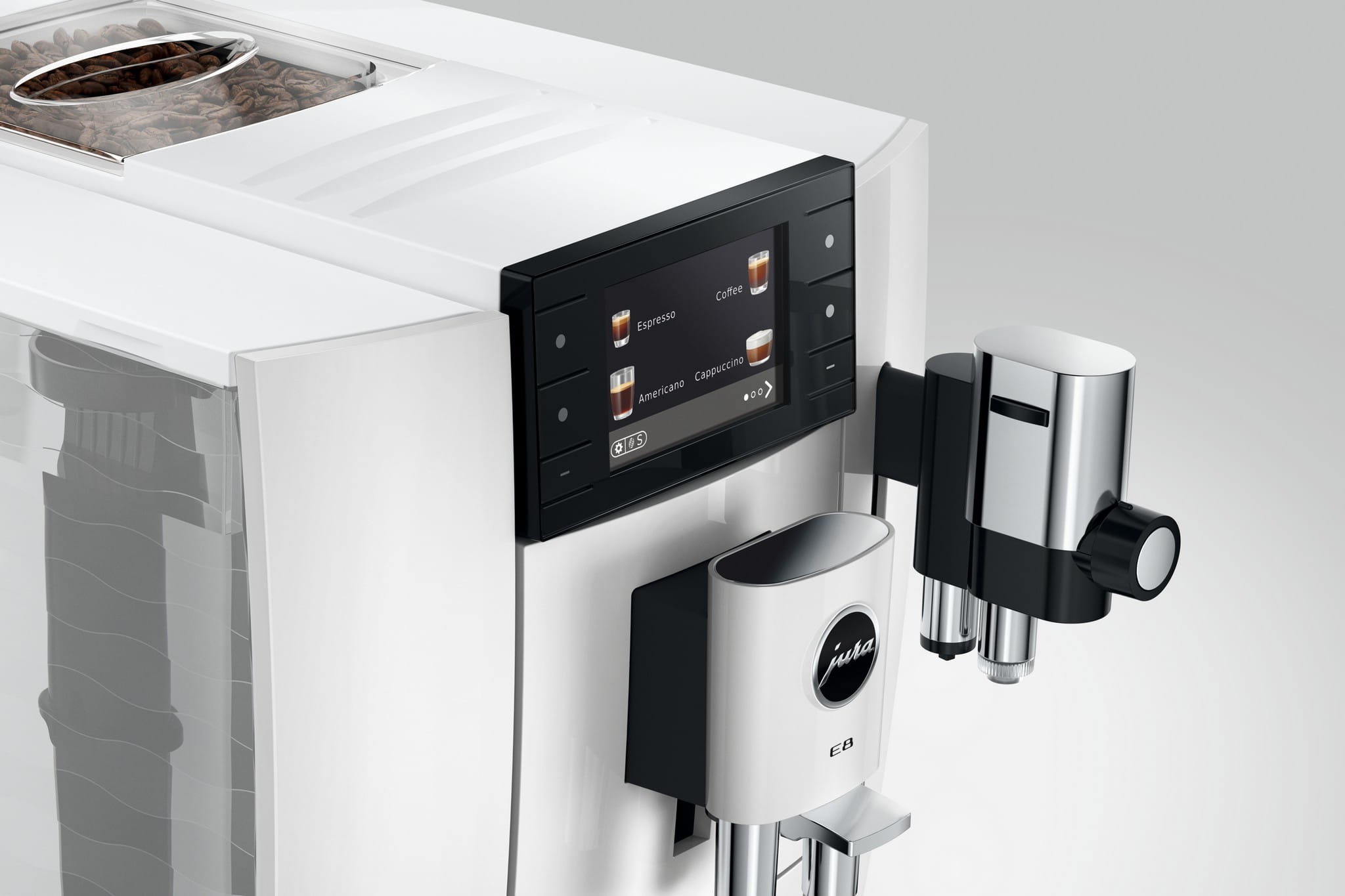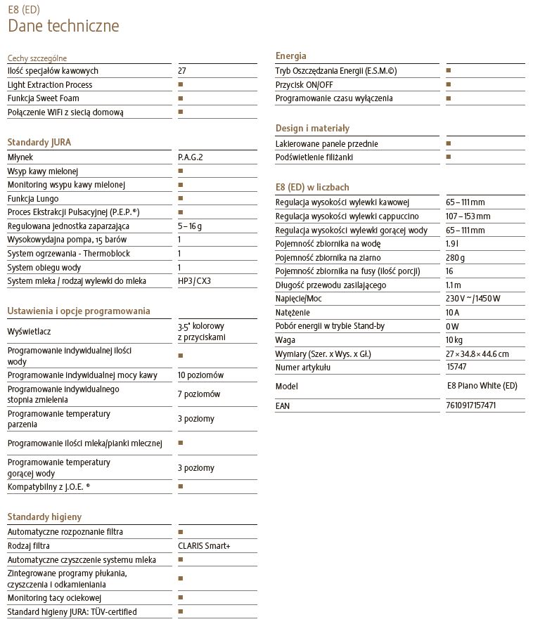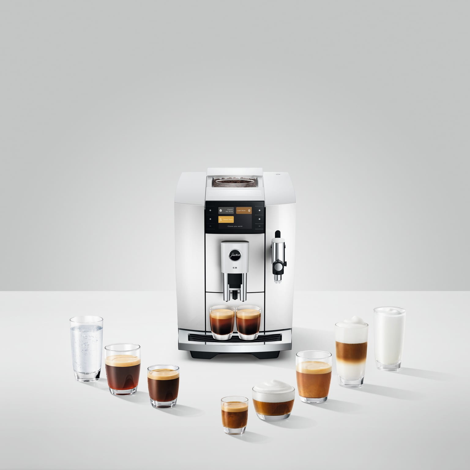 E8 w swojej najnowszej generacji łączy w sobie trzy wymiary przyjemności. Opanowuje gorące klasyki, serwuje Light Brew w czarujący i dopracowany sposób i zaprasza do subtelnie osłodzonego świata przyjemności. Ich różnorodność obejmuje 27 specjałów, które nadają każdej kawie preferowaną nutę i dopracowany aromat – od Hot, poprzez Light, aż po Sweet.