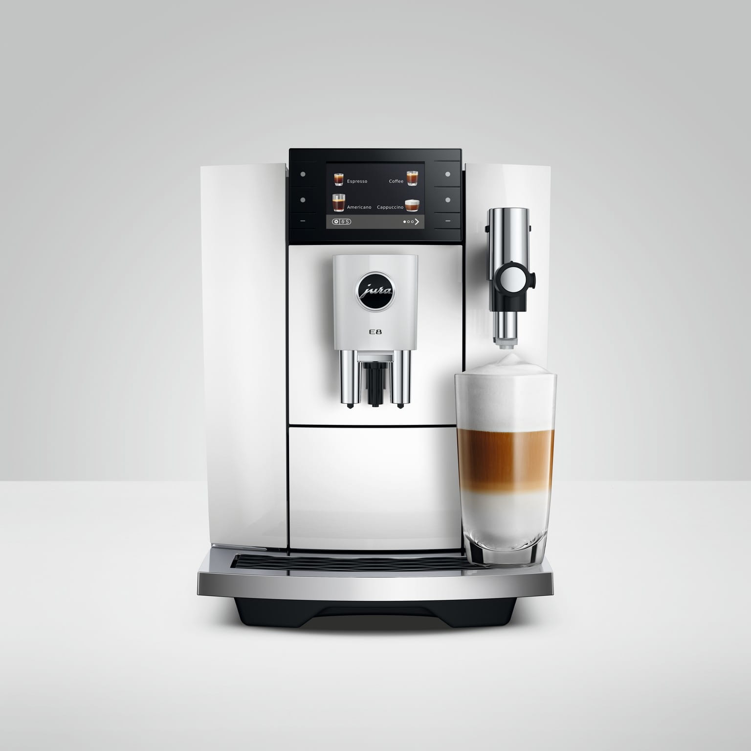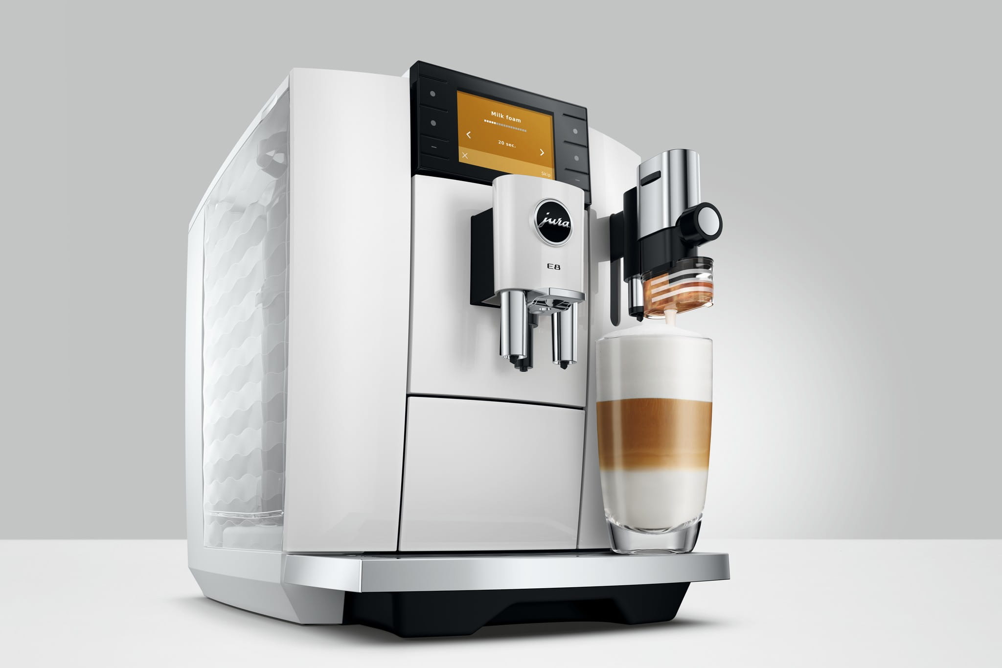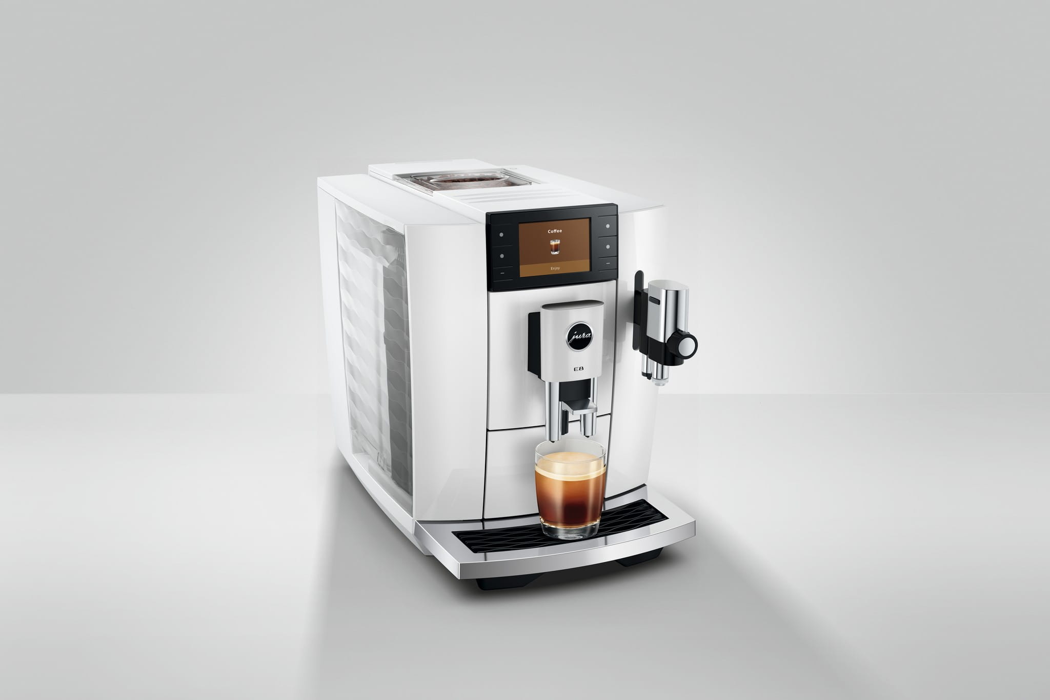 Najpopularniejszy model ekspresu JURA doczekał się już piątej generacji i oferuje pionierski komfort obsługi oraz imponujące trzy wymiary przyjemności. Klasyczne Hot Brew, Light Brew i Sweet Foam zapewniają niezrównane kawowe chwile, których można doświadczyć dzięki E8.